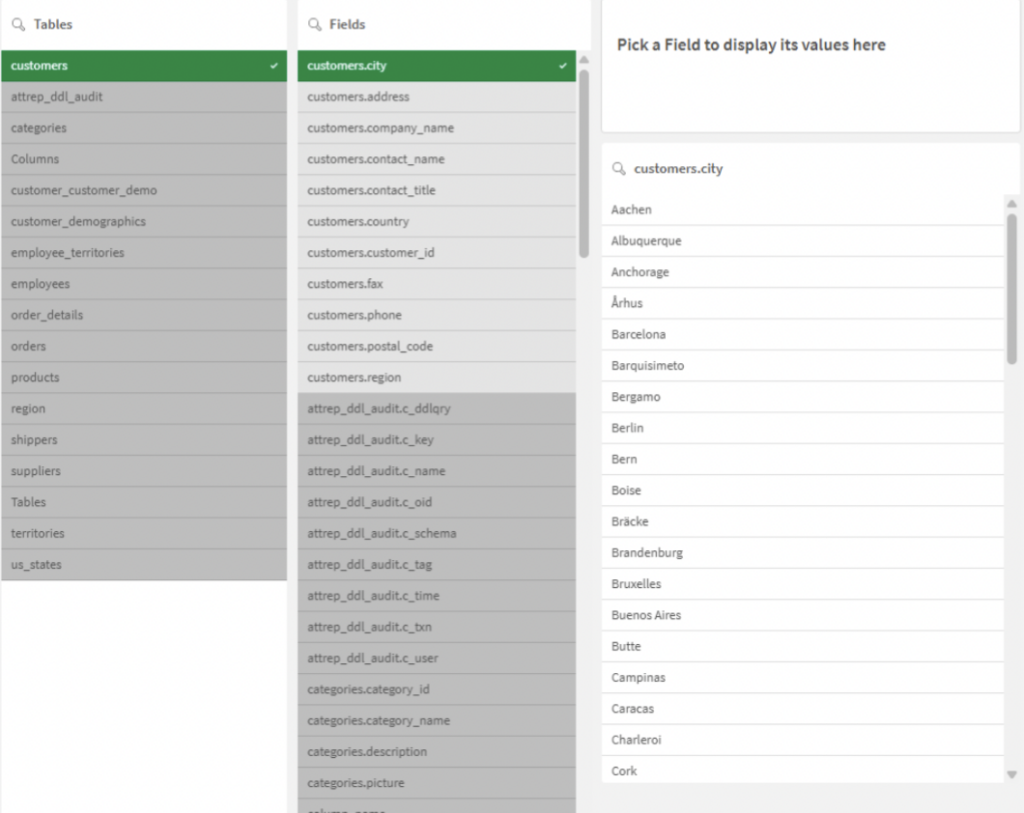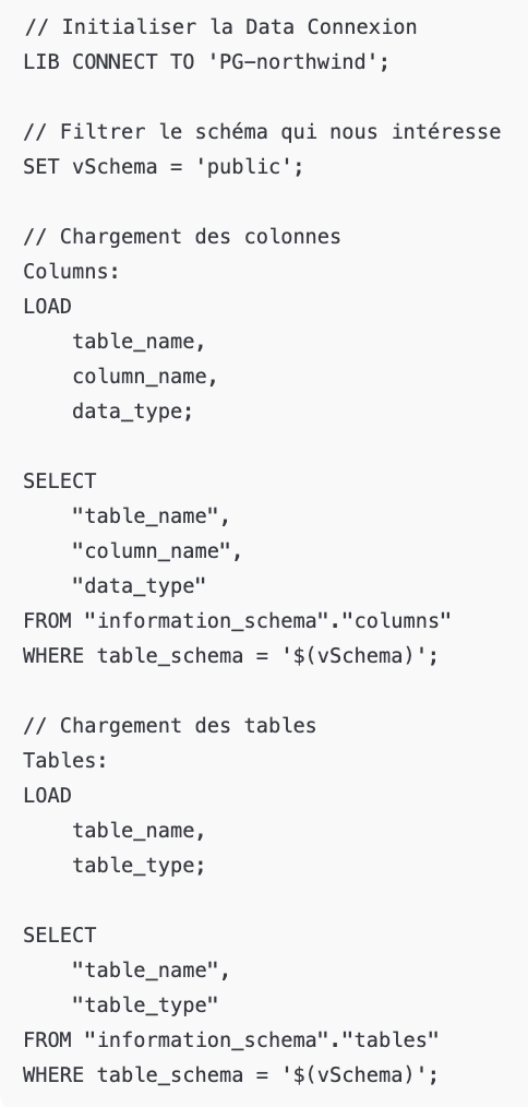 L’astuce “Qualify” permet de préfixer tous les champs par le nom de leur table source. L’objectif est simple : éviter la création automatique de liens entre les tables dans le modèle de données de Qlik. Pour cette phase d’exploration, nous voulons juste consulter les tables de manière isolée, sans structure décisionnelle.