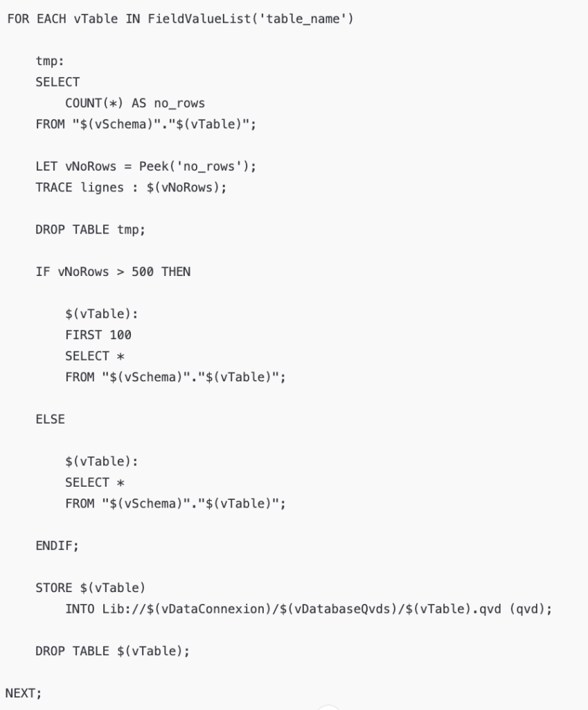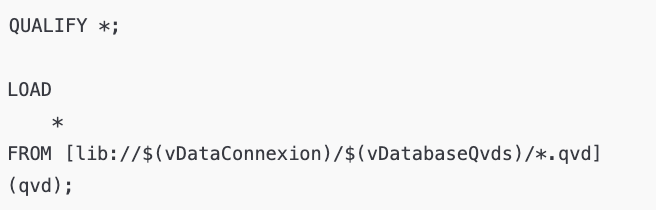 Cela évite à Qlik d’indexer le contenu de tous les champs lors du chargement, accélérant ainsi le temps de rechargement pendant que vous travaillez sur l’extraction. (Notez également que le chemin de stockage des QVD sera géré par des variables de projet à adapter selon votre système de fichiers.)